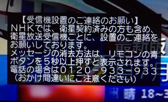 このメッセージは、「NHKへ連絡すれば消える」だけの「話」ではありますが、自動的に「NHKにBSチャンネルが映る」事を知らせて「衛星契約を結ぶ」必要が発生します。