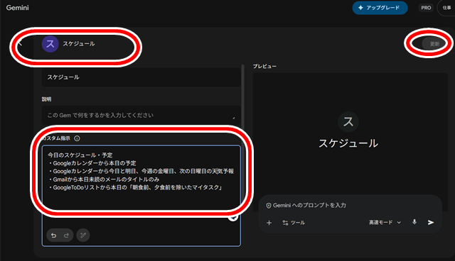 今回は、作成するGemの名前を「スケジュール」に設定、「カスタム指示」欄に以下の内容を入力し、作成実行します。