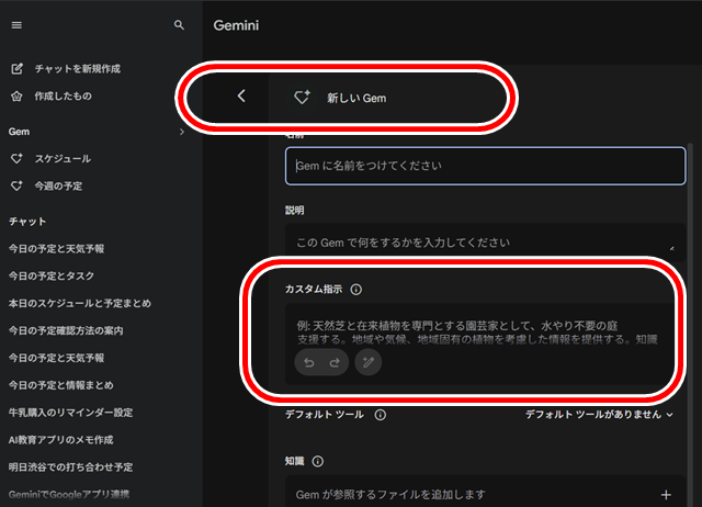 この機能を作成するにはGoogle Geminiの「Gem(ジェム)」機能を使用します。