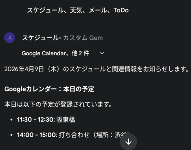 今回は、スマートフォン上を巡回することなく、Geminiのチャット画面上で音声一言でこれらのアプリから「今日のスケジュールをまとめて教えてくれる」ようにカスタマイズする方法を「検証」します。